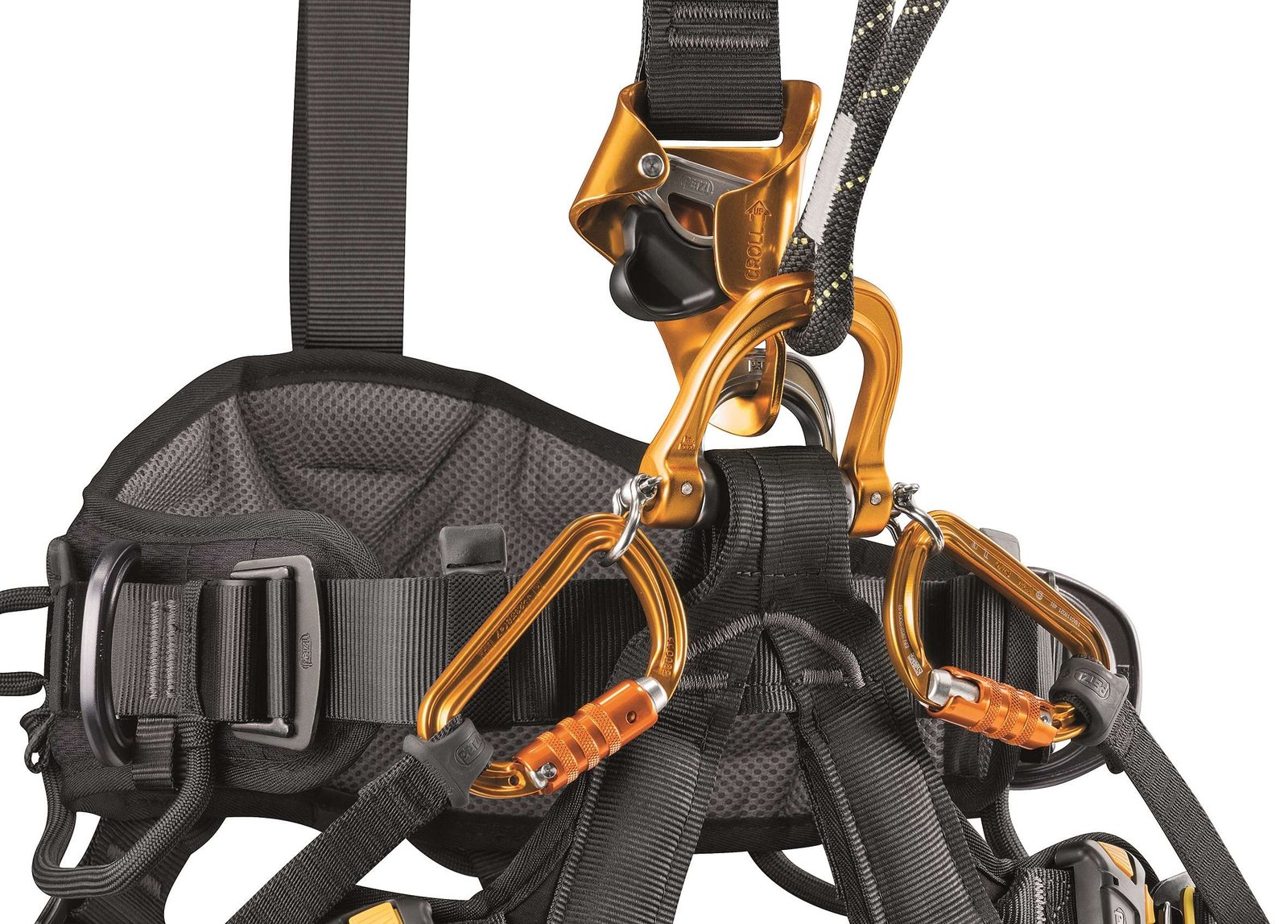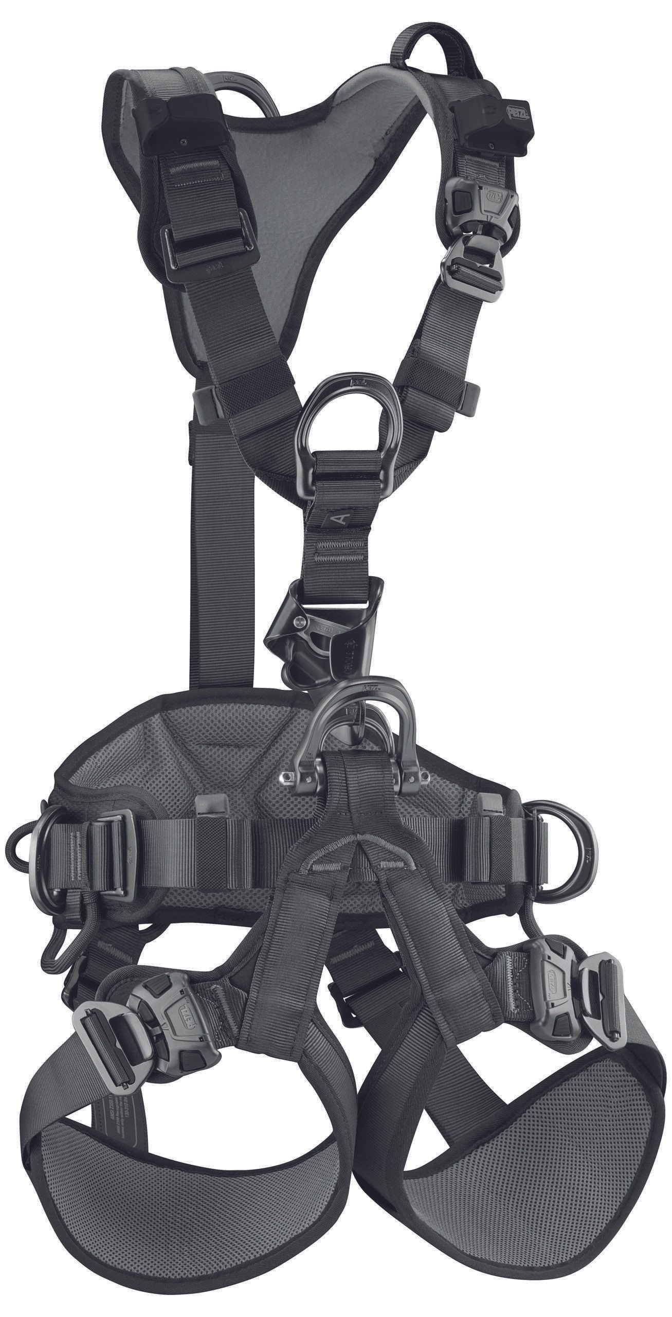 With an integrated CROLL L ventral rope clamp, the ASTRO BOD FAST harness is designed for greater efficiency and comfort during rope ascents. The gated ventral attachment point allows optimal integration of equipment (rope clamp, seat…). Wide, semi-rigid waistbelt and leg loops give excellent support. They are contoured and lined with breathable foam padding for comfort when suspended. The DOUBLEBACK self-locking buckles at the rear of the harness, between the waistbelt and the leg loops, allow for a shorter adjustment when the dorsal attachment point is used. The harness also facilitates the carrying and organizing of work tools, with multiple equipment loops and retainers for attaching CARITOOL tool holders and TOOLBAG tool-holder pouches. It has a fall indicator on the dorsal attachment point and is certified to North American and European standards. ASTRO BOD FAST international version features leg loops with FAST automatic buckles.