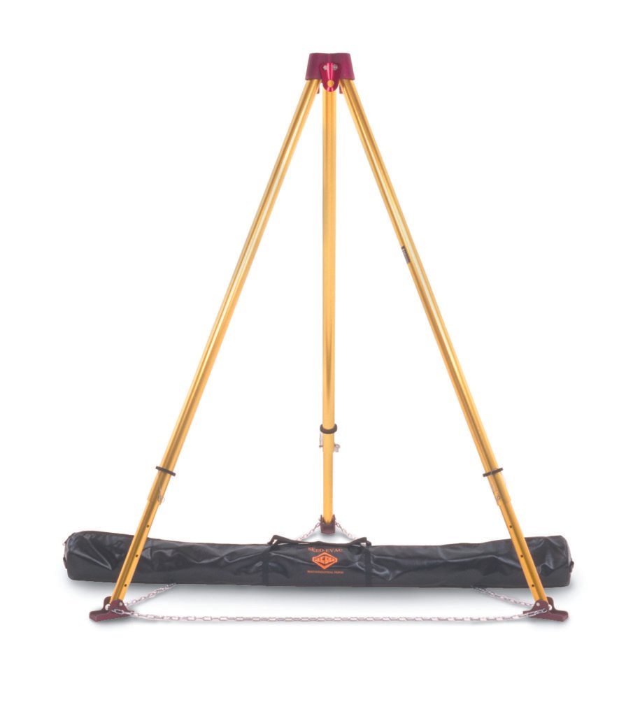Manufactured by Skedco, makers of the Sked® Stretcher, the Sked-EVAC tripod features aircraft-grade, gold-anodized aluminum legs and a cast-aluminum head. Three heavy-duty rigging anchors, located in the center, have exceptionally large holes for easy attachment. Legs adjust in 13 cm (5 in) increments for a max leg extension of 254 cm (100 in), a maximum height of 3 m (10 ft). Its minimum working height is 1.8 m (6 f)t and its minimum length for transport is 2.1 m (7 ft). The cast ladder feet swivel and come with a choice of a sure-grip rubber pad or a point for embedding in a soft or slippery surface. Holes in the feet allow the tripod to be bolted into position. A safety chain prevents leg movement and adjusts with a screw link. Carrying bag not included – sold separately.